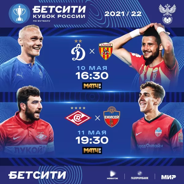 В жеребьевке примут участие экс-футболисты сборной России Дмитрий Аленичев и Дмитрий Сычёв. В полуфинале сыграют московское «Динамо», красноярский «Енисей», «Алания» (Владикавказ), «Спартак» (Москва). Встречи 1/2 финала БЕТСИТИ Кубка России пройдут 11 – 12 мая.