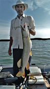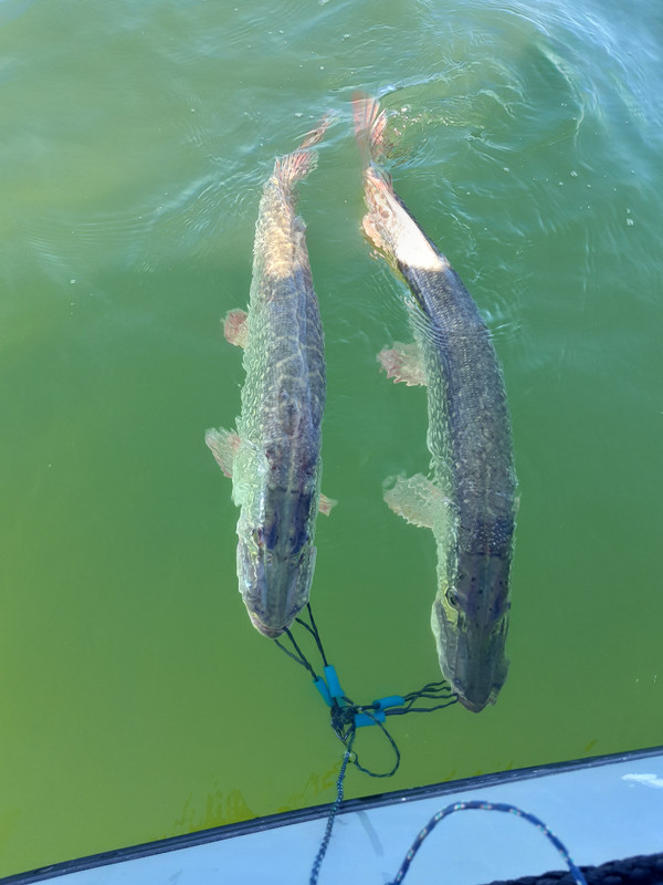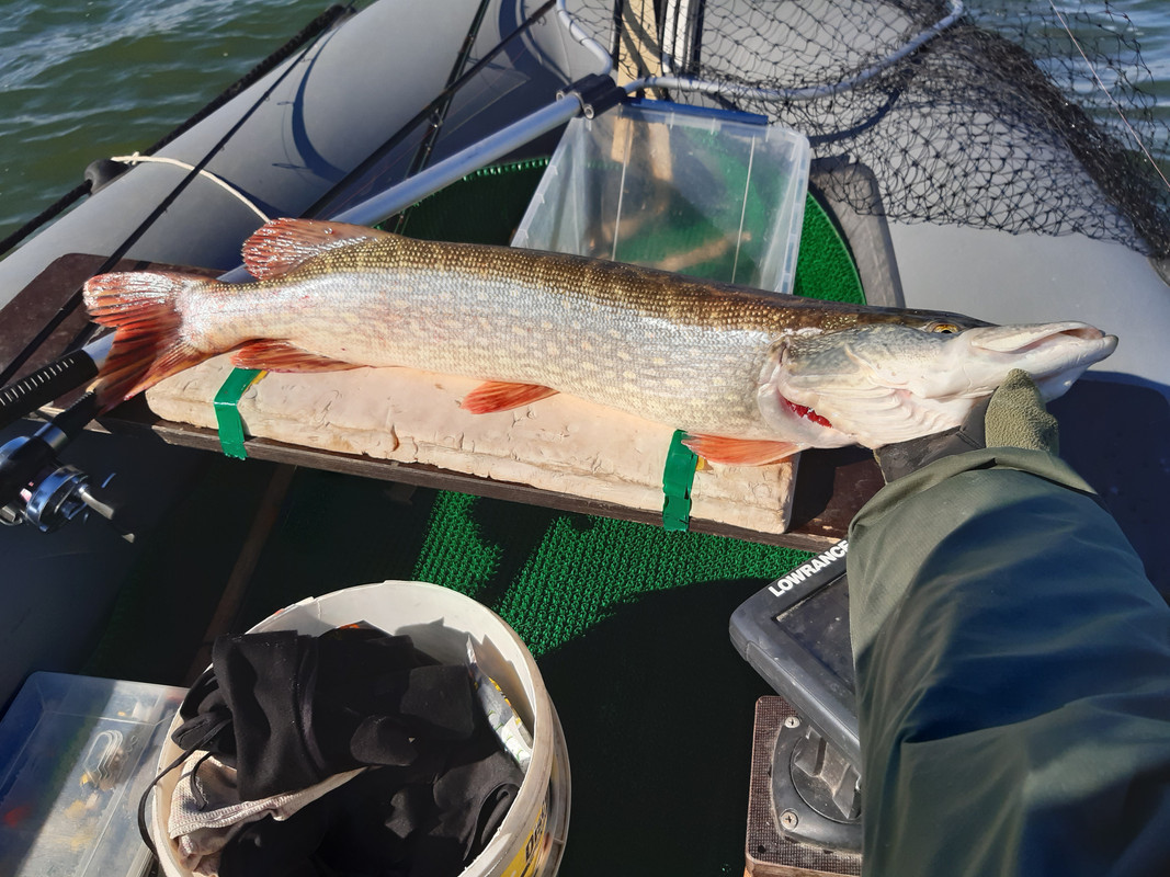 Но это совсем не главное. Такой злой и сильной щуки я не ловил точно лет шесть. "Рука бойца колоть устала" - вчера это выражение было вовсе не аллегориtq,  а реальность.: последняя пойманная "примерно четвёрочка" напрочь отказывалась познакомится лично. Поднять -то на поверхность я её смог без проблем, а вот завести в сачёк ни как не получалось: завидев сетку щукан рвал когти так, что стягивал нитку с насмерть затянутого фрикциона, нарезал круги вокруг лодки так что, вопреки моем желанию хлыст иной раз полностью затягивал под воду. В конечном итоге рыба выиграла схватку - крюк разболтался в челюсте и на очередном кульбите рыбы вывалился из раздолбанной дырки.