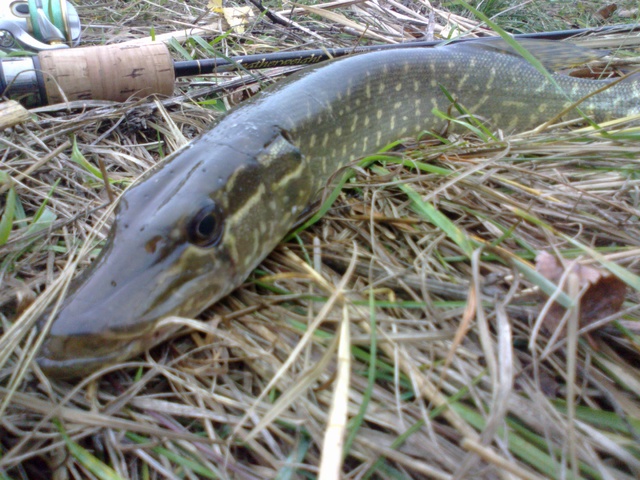 Сегодня у отца появилось свободное время и мы решили провезти его с пользой на свежом воздухе со спиннингами. Т.е проехаться посмотреть новые места по хищнику вот, проезжаем мимо лужи решили остановиться, покидать немножко. Первый заброс ничего, второй тоже, меняю приманку на маласа и чувствую удар и после не долгого вываживания шнурок на берегу. Аккуратно снимаю с крючка и отпускаю подрастать, следом у отца тычок и тоже карандаш грамм на 200 на берегу, но у отца он оказался более жадным поэтому пошел на засолку. И так продолжаем бросаем еще в течение полу часа 2 шнурка. И вот у отца тычок чувствуется сильное сопротивление и после 10 минут вываживания щук на берегу. Щучка потянула на 2.5 кг. Это первая рыба вытащенная такого размера на плетню 0.12 на ул. Так что рыбалачкой остался доволен плюс еще одно неплохое место по щучки вот так вот.  ;D (фото щуки ниже)