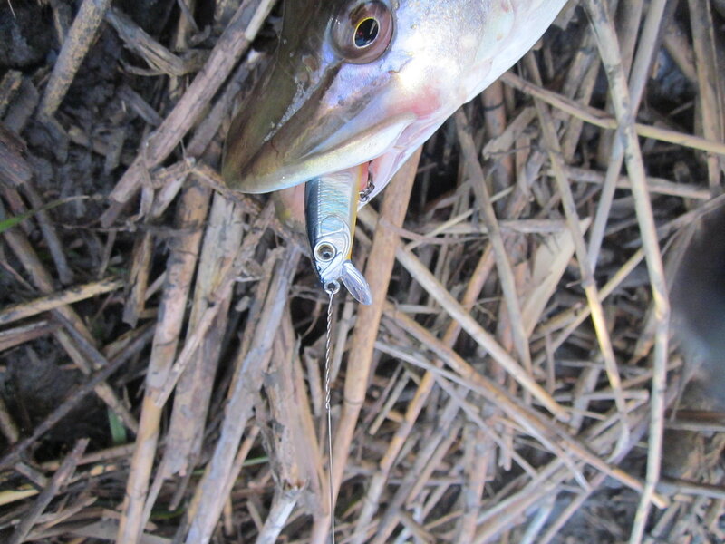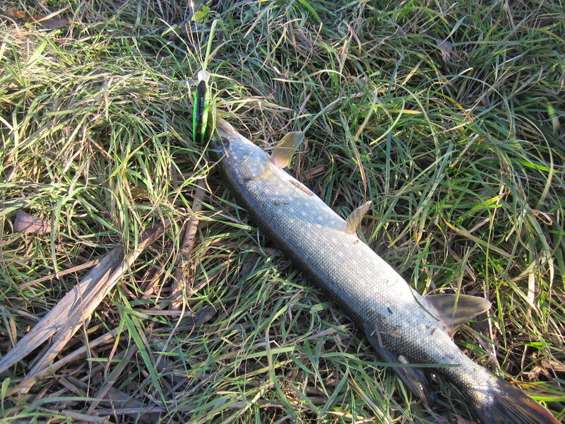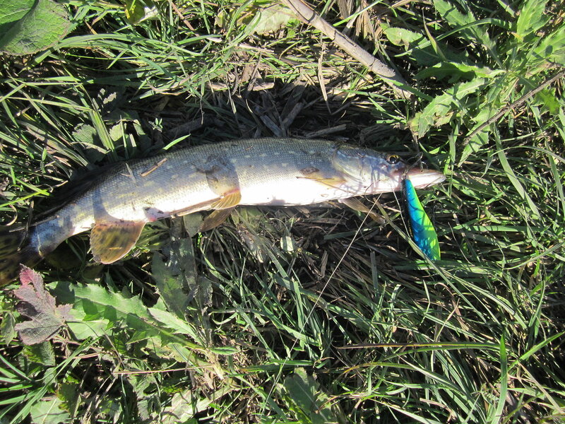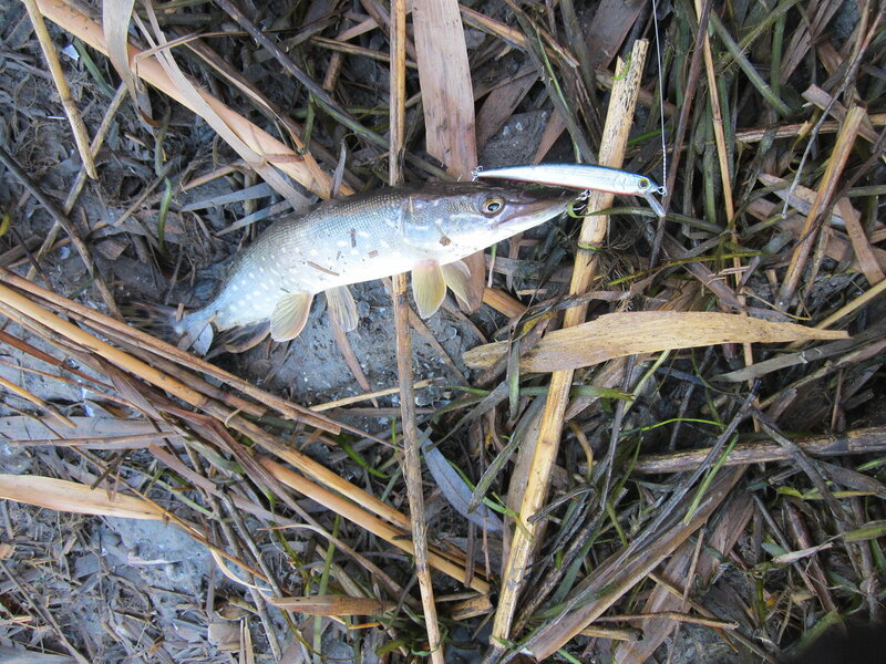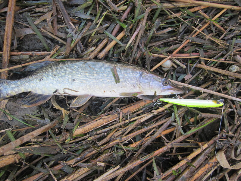 И мне всё таки улыбнулась фортуна-злая щука,совершила несколько атак на мой воблер и уже почти под ногами схватила его,и оказала достойное сопротивление.(Masu Masters Minnow 58F рулит,а на тонюсенького Файзера,ловить такую щуку одна песня  ;D )