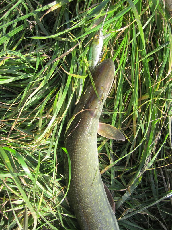 Как и говорил, в воскресенье получилось выбраться с кумом на рыбалку. Решили сразу рвануть (за поворот), что против далеко не слабого ветра было сделать сложно. на месте, кидаем как бы якорь, глубина метра 3-4. У меня затаилась мысль что тут мы ничего не возьмем, в принципе так и получилось, Игорь поднимает 3 шнурков, у меня же 0, только 1 удар и все. полтора часа полоскаем воблера и безуспешно. Решили вернуться обратно на меляк, глубины до 1,5 метра. И как оказалось правильно. Якоримся и начинаем облавлевать участок, на очередной проводке выдерживаю паузы примерно по 6 секунд и это дает свои результаты, удар, несколько приятных секунд борьбы и килошка в руках, после были ещё удары и один сход. Ветер сильный, пронизывает до костей и в очередной раз жалею что не взял с собой термос горячим кофейком. Решаем прекращать нашу водную прогулку выгружаемся на берег, лодка на сушку а мы пока она сохнет решаем ещё на последок попытать счастье. И на третьей проводе в момент объяснения куму что сейчас пятнистая любит паузы, подтверждаю слова на практике, при паузе (довольно таки долгой) удар и сопротивление не шнурка, немножко борьбы и щучка (на глаз) 1,5 гк +- у меня в руках, между спинным плавником и хвостом затянувшаяся рана, не понятно от чего. Итог , кум повез домой 4 до килошных, я же забрал 2 , отец захотел Хе. 2 шнурков отпустил, на что Игорь как всегда покрутил у виска пальцем, сопровождая это все крепкими словечками ))