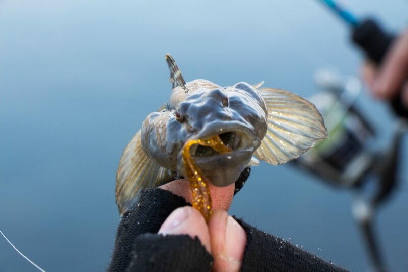 Не прошло и полчаса, как Леша ловит первую рыбу!!! Взял судачок на Reins G-Tail Saturn 2.5'' кислотного цвета.