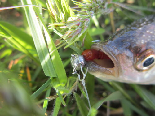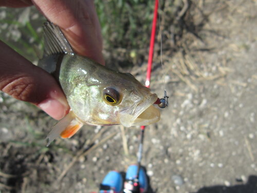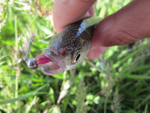 Потом в бой пошли бэт а шеды, как суспики так и плавунцы. Но и они не принося ни чего. И вот дума придумалась, хорошо бы поперочка поставить. Но только облегченный Дэд флодик. Проводки с подхлюпыванием и выход детского шнурка, чуть больше чем сам воб. Переставил на SUM LURES COTTON AS YA  и при проводке хлюпы на месте, первый дельфино-шнурок, атаковал, но не был готов. Подсек ,но  промах. Новые забросы, та-же игра и шнуркобес на фото сессию. Потом свобода.