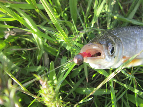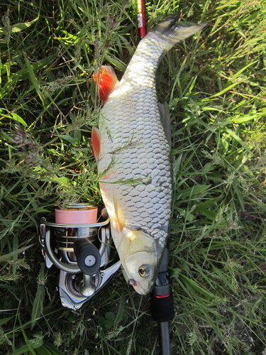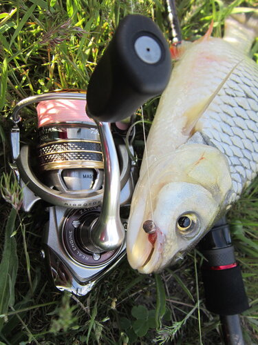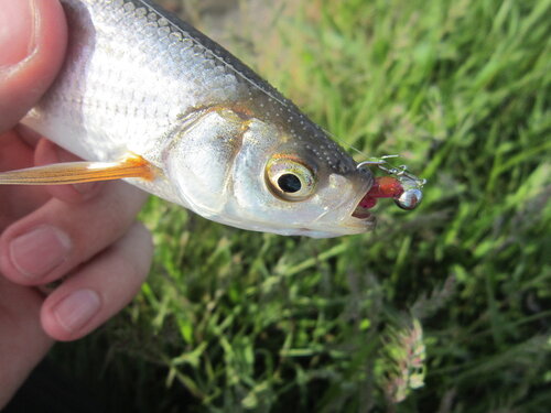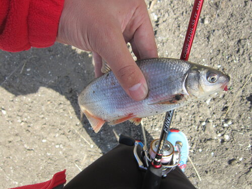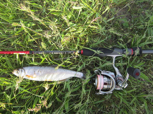 Суббота, школа, уроки,  и пропущенное МТО...  Плохо конечно, что пришлось пропустить турнир, но «Учиться, учиться и еще раз учиться», как говорил великий Ленин. В общем, отучился до 12:00, все домашние дела были выполнены еще в пятницу,  бегом домой, взял рюкзак, Финку и вперед на автобусную остановку, доехал до речки и прошелся пару километров  до места Х, хотелось и просто половить рыбу, и заодно потренироваться в похожих условиях перед соревнованиями. Место очень интересное, основное русло реки упирается в некий полуостров с поросшим камышом и образуются две сильные струи, которые сливаются чуть за серединой этого полуострова, образуя перекат, под обоими берегами множество довольно глубоких обраток, в которых крутится рыба(и мусор в том числе). Основной целью был голавль и гибрид на мдж. Очень хотелось его поймать на такой запрессованной речке ультралайтом, заодно и взять реванш за прошлые рыбалки здесь, т.к. много раз я пытался здесь его поймать, но были лишь пустые поклевки, количество голавля в реке очень маленькое.   Почему я взял Финеззу!? Все просто, более универсальная палка для данных условий, длина спиннинга(221см) не проблема, т.к. камыша мало, деревьев и высокой травы нет,  в ветер ее мягкий кончик очень помогал отслеживать проводку приманок. Ловить начал примерно с двух часов дня, колебалки, вертушки, воблеры - все бестолку. Лишь стаи шемаи провожали до берега приманки, изредка клевали  на проводке, но их рот маловат, даже чтобы заглотить 1,1 граммовую маньячку. На одной из проводок забагрил Ниакисом одну уклейку. Прошелся в конец переката, покидал различного веса  колебалки, всякие крэнки, голавля так и нет, даже его поклевок. Ветер немного стих, и как говорят «Если гора не идет к Магомеду...», я привязал мормышку(чтобы хоть что-то поймать и уйти от ноля) 0,8гр.+приманка СF Whitebait в цвете «Лох», ловил в тех самых прибрежных обратках, проводка- 5-6 микрорывочков и пауза 2-3 секунды. При первых проводках сход шемайки, потом второй прям под ногами и уже потом четкий удар, недолгое вываживание и приятный рыбец(!) в руках, недурно, подумал я...