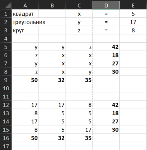 Цитата: khakhin от 02 мая 2025, 23:07:31Примем, что: квадрат - x, треугольник - y, круг - z и запишем первые три выражения в виде: