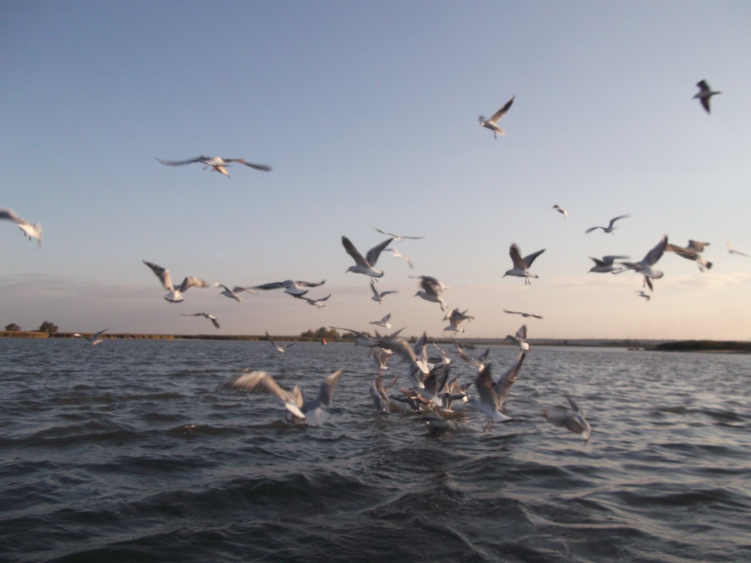 Наступил вечер, стали собираться. Покормили чаек и обратно, вверх по течению. Вода ещё ушла на пару метров. Ветер почти стих.