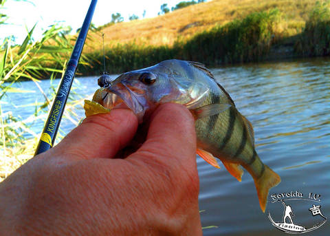 Приехал все зарощее и не проходное, если бы не жигули с куском железа вместо так называемого бампера  ;D я бы туда не пробрался. Сделал несколько забросов глухо как в танке. Затем спустя несколько минут отозвался малыш окушок и был тут же утоплен. Переехал на более открытые места сделал пару забросов и тут удар, небольшая щучка на поверхности уже, срезает мне приманку. Ставлю титановый поводок очень тонкий ну что бы и окушка половить. Делаю левее вдоль реки заброс и такой отчетливый ударчик, сопротивление и хороший окушок позирует на камеру  ;)
