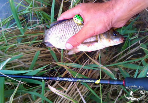 Погода что то не радовала, натягивало тучки и через минут двадцать по приезду начал накрапывать дождик. Тут мой попла попер резко уходит в сторону подсекаю, свист фрикциона и на той стороне моей снасти что то упирается серьезное, это не плотва... Минутку вываживания и приятный карасик позирует на камеру. Взял из далека, практически на середине реки, ( глубина в месте лова 20-50 см. остальное ковер из травы)