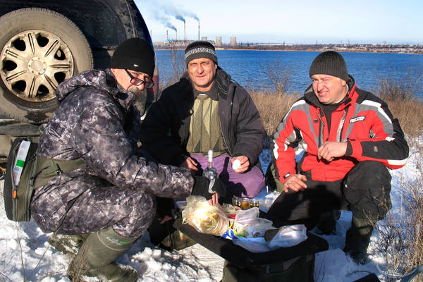 Поймав несколько плотвиц решил закормиться и сидеть, в дальнейшем было понятно что бегатня и лишнее бурение не очень приносило успех, все таки упор был по плотве. Трое наших ребят пошли в толпу, где народу больше, и "рыбы тоже" Но оказалось все совсем не так... Спустя пару часов вернулись к нам, и стали полавливать плотву. Клев был конечно не стабилен, проклюнится три штучки и затихло на 15-20 минут, затем опять. Такой клев был целый день. Снасть балалайка, лесочка 0.8 мормышка мелкий опарик и шарик, цвет не имел значения, кормил "темной плотвой" с добавкой макухи.