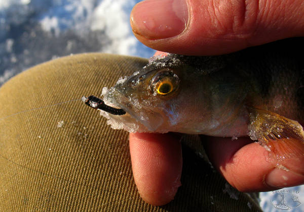 Здесь дело пошло поинтереснее, я так же ловил на балансир и затем на чертика с подвесным тройничком, Игорек на мормышку. Сначала я его облавливал и окунь у меня был покрупнее, затем ближе к 16.00 клев стал лучше на мормышку с мотылем, мои балансиры и чертики он стал просто игнорить   :(  Но я не переставал упираться в черта   ;D и он принес мне еще пару матросов.