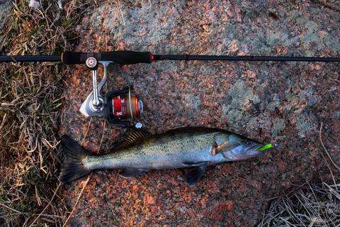Обловив несколько точек поняли что у рыбы обед, сели сами перекусили чайку горячего попили и пошли далее на поиски клыкатого. Да, конечно в поисках рыбы бывало такое что на пять забросов два обрыва приманки о скалы, но другого варианта не было, там нужно было и искать рыбу. Ближе часам к трем рыбка начала себя проявлять, немного даже поднялось настроение  :)