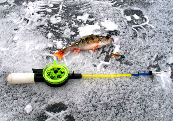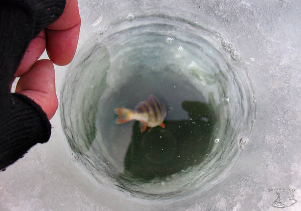 в 8.00 на водоеме и сразу с бой! Вышли на лед, забурились. В течении полу часу не тычка. Пять человек ловили все на разное, как бы для эксперимента. Немного разбрелись и у Игоря под берегом поклевывал нано окунь. Я упирался на силикон, перепробовал несколько приманок, затем поставил дюймового рачка от нашего мастера Gari и проклюнулся вот такой окушок, уже как то и на душе стало приятнее  ;)