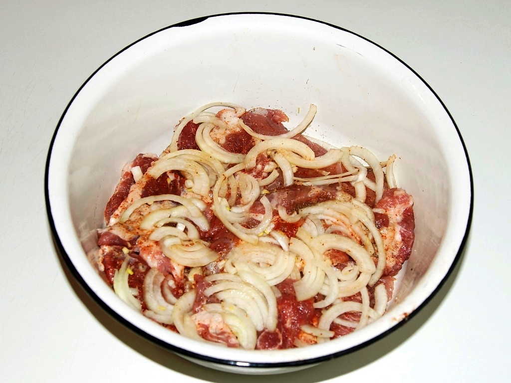 Через час, берем две средних луковицы, рЭжем полукольцами и перекладываем ими мясо. Опять мясо "отдыхает"..., примерно, час-полтора...