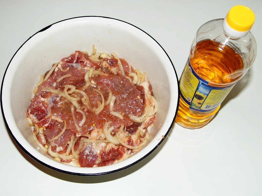 Заливаем две ложки растительного масла, перемешиваем, распрямляем мясо, поправляем лук... и снова отставляем в сторонку. На часоК.