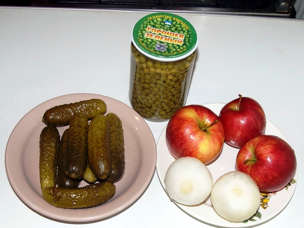 1. Маринованные огурчики, зеленый горошек, пара головок белого лука и кисло-сладкие яблоки.