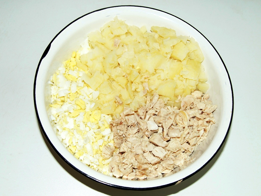 Традиционноая рецептура, в каждой семье она своя, годами проверенная, привычная и любимая. Я использую способ условного разделения двух основных составляющих "Оливье":