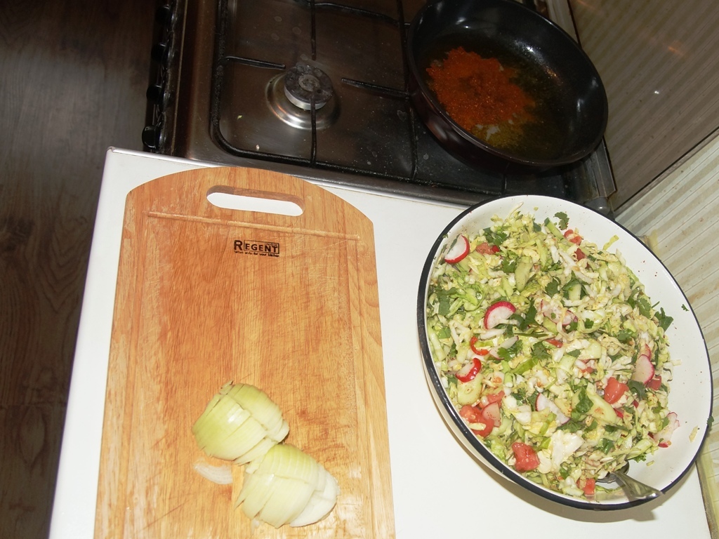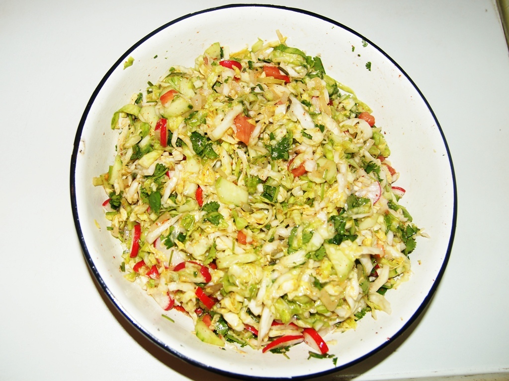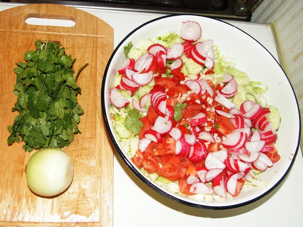 2. Шинкуем огурцы, редиску, помидорчики, зелень, как для обычного салата. Засыпаем в капусту.